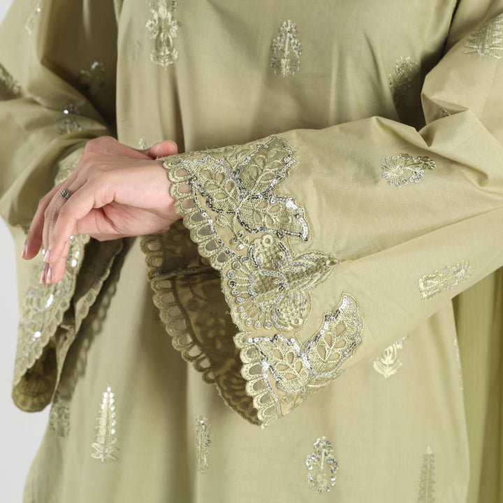 The shirt is tailored to perfection, with a silhouette that flatters the figure while maintaining a graceful flow. The soft apple green hue exudes calmness and serenity, making it an ideal choice for both daytime elegance and evening glamour. The embroidery adds an artistic charm to the outfit, while the color palette remains fresh, modern, and sophisticated.