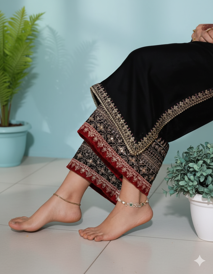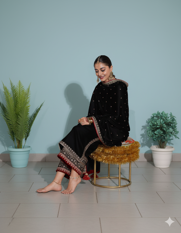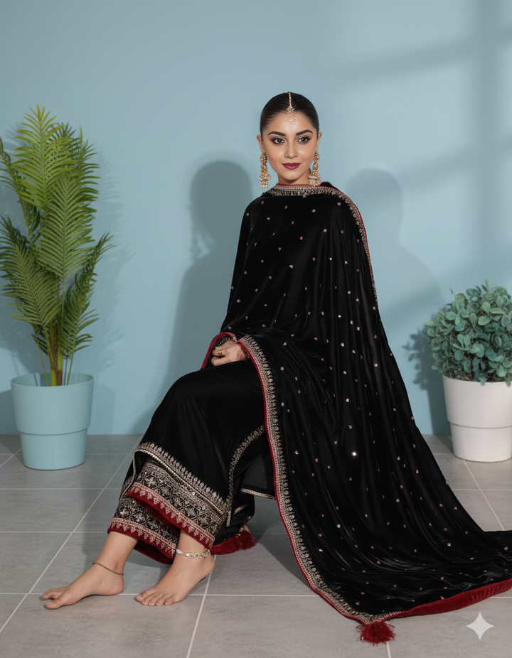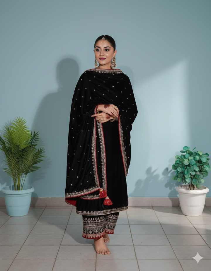 Black Desire is the epitome of winter elegance — a masterpiece designed for the woman who embraces timeless charm with a modern edge. Crafted from premium viscose, this stunning black ensemble is adorned with exquisite maroon and golden embroidery, adding depth, luxury, and allure to every detail. The full-sleeved long shirt features intricate embellishments along the neckline and cuffs, complemented by refined straight trousers that complete the regal silhouette. The chiffon dupatta with elegant edging enhances the overall grace, making it a true wardrobe essential for this season.