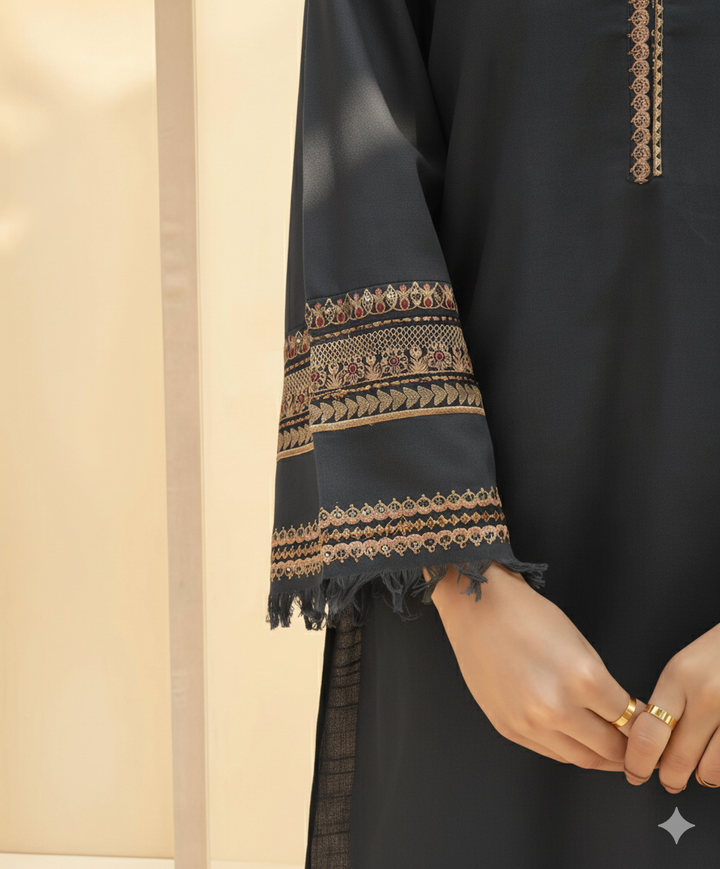 Experience timeless sophistication with Grey Noir, a luxurious 2-piece khaddar suit crafted for those who appreciate both elegance and comfort. This ensemble in a deep, rich Grey showcases beautifully embroidered borders on the sleeves and pant cuffs, reflecting meticulous craftsmanship and attention to detail. The khaddar fabric offers warmth and durability, perfect for cooler seasons, while maintaining a refined look.