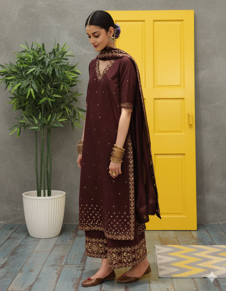 Mahroon Grace is a masterpiece of timeless design, featuring a full-sleeves long shirt adorned with intricate golden embroidery along the hem and neckline, creating a stunning contrast against the rich green fabric. The straight trousers are tailored to perfection, with delicate embellishments that harmonize beautifully with the ensemble, making \Siyah Jahan embodiment of elegance and allure.