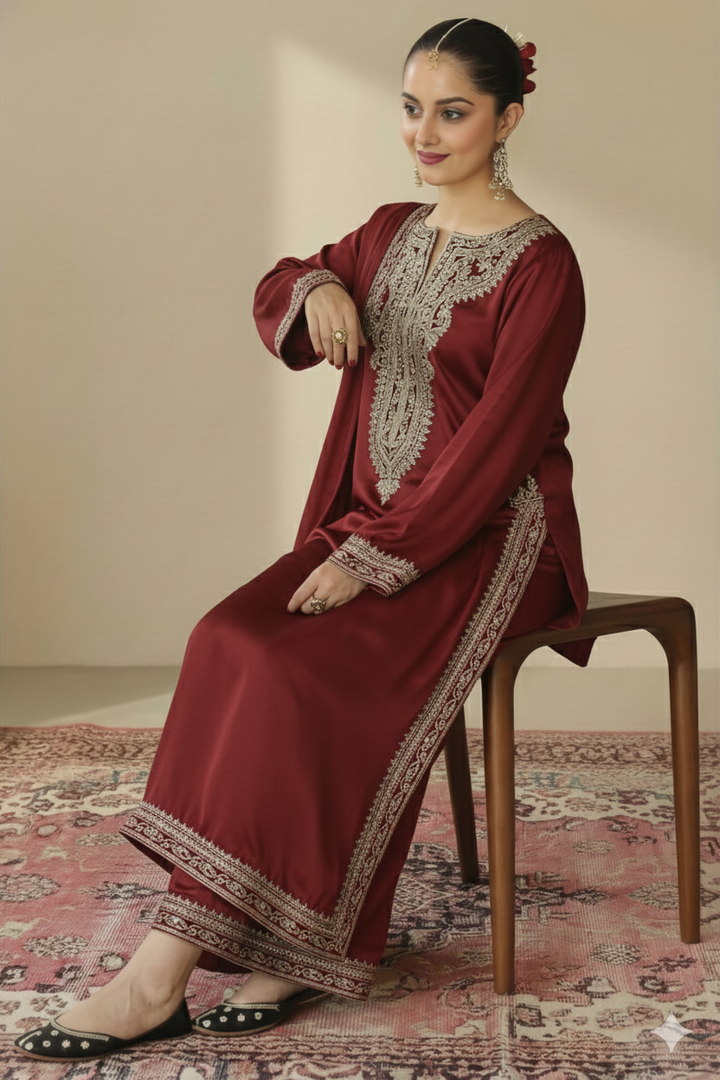 Step into elegance with Maroon Majesty, a luxurious 3-piece outfit designed for women who adore sophistication, comfort, and timeless style. This suit is available in Viscose allowing you to choose the perfect texture and drape for your occasion. Each variant is paired with a flowing chiffon dupatta featuring delicate golden borders for a regal finish.