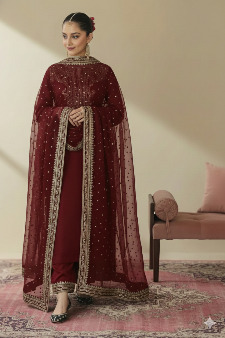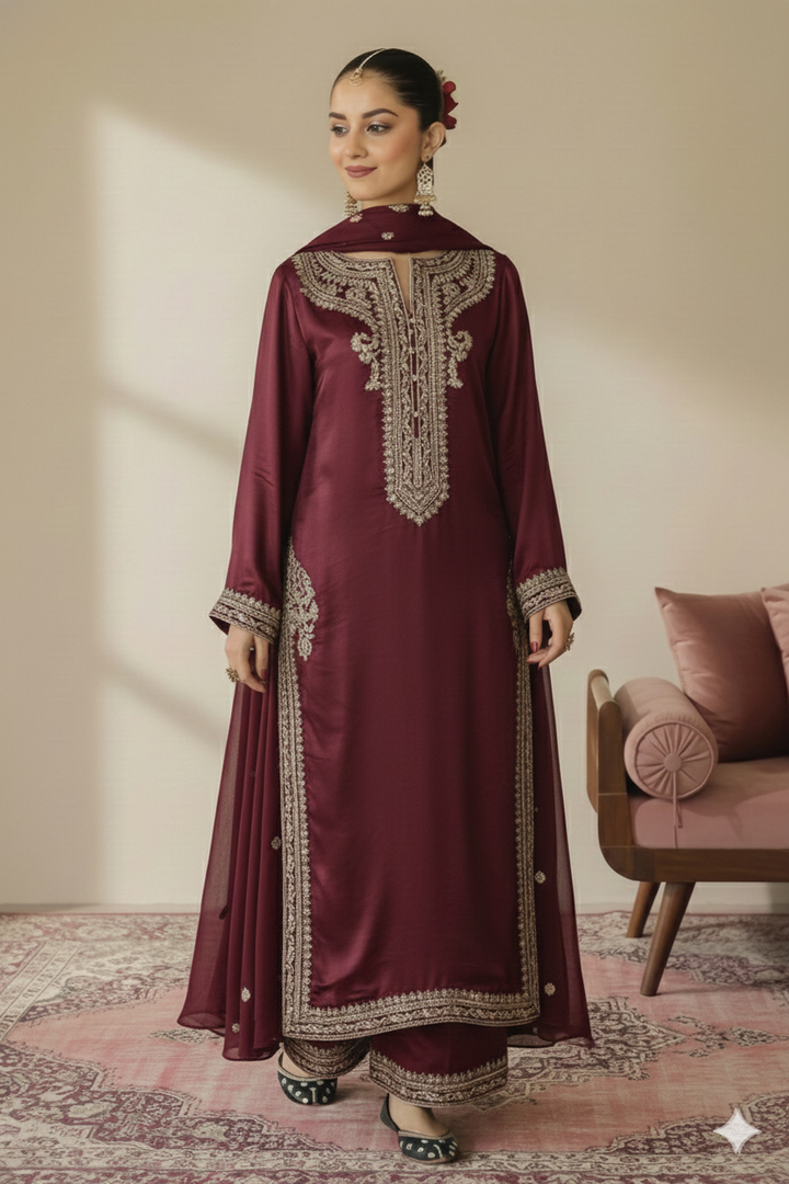 Maroon Majesty – 3 Piece Suit (Velvet & Satin Options with Chiffon Dupatta)