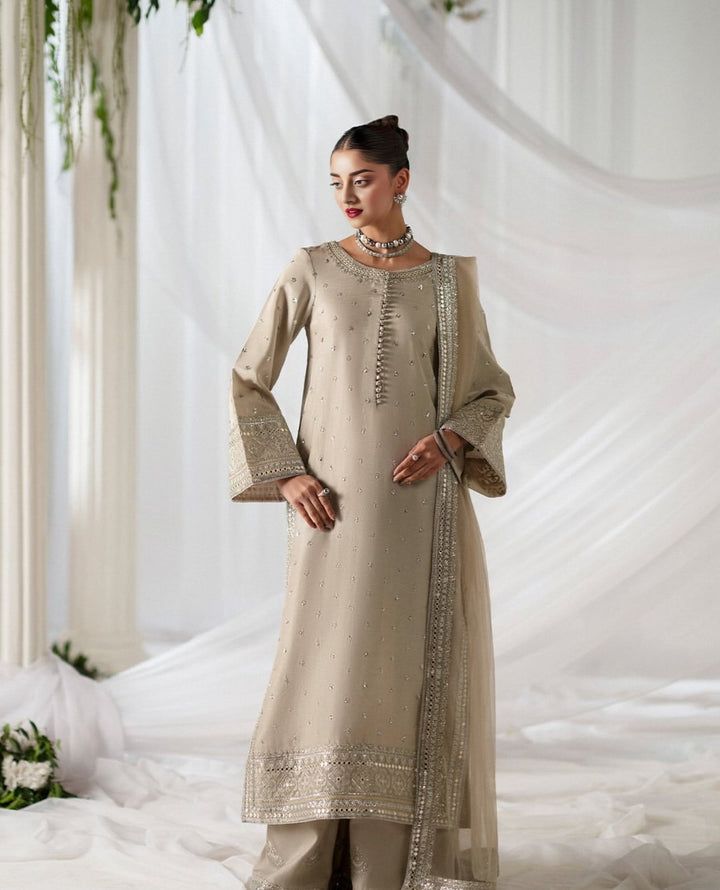 Introducing Moonlight Beige, a masterpiece from Maharani Collection. This 3-piece embroidered suit features a richly textured shirt with intricate detailing, matching trousers, and a lightweight chiffon dupatta with fine embroidery.